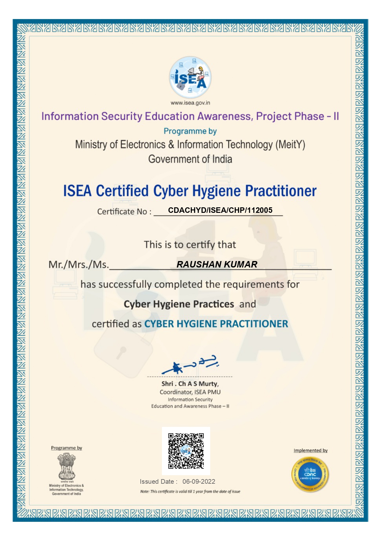 Glad to inform that i have completed the requirements for the Cyber Hygiene Practices, by MeitY Govt. of India and got certified as Cyber Hygiene Practitioner💫Congratulations on earning the Cyber Hygiene Practitioner certification from MeitY, Government of India! It's a significant achievement in enhancing your understanding of cybersecurity practices